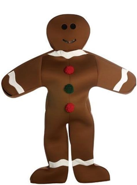 Inclui um macacão com a forma de homem de bolacha em castanho, com os adornos em branco e 3 botões no centro.